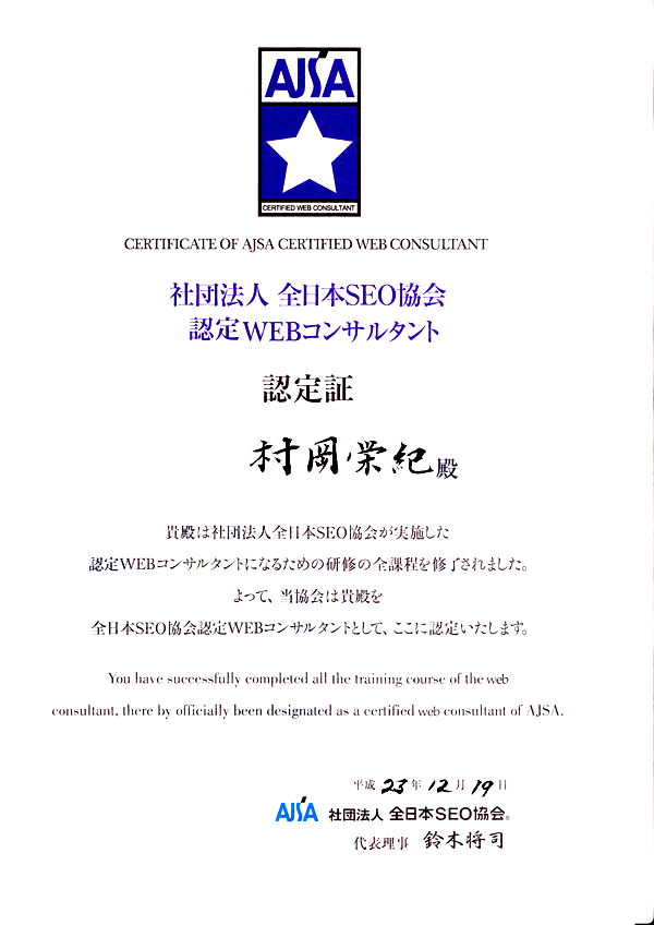| 全日本SEO協会 SEOコンサルタント認定書 |
